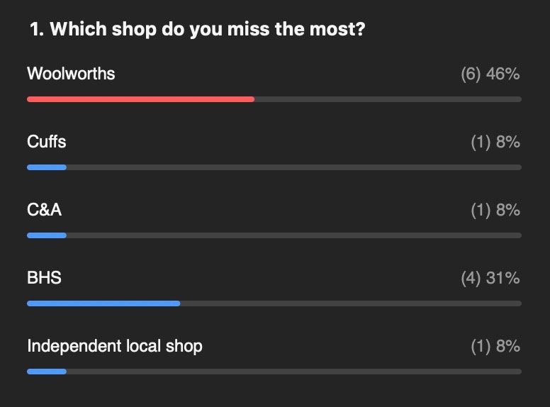 Not everyone voted, but Woolworth was popular, as were a few department stores from the local area such as Hinds of Eltham and Chiesmans of Lewisham. The Independent local shop remembered was in Liverpool – a “Pound Shop“, that in those days sold items for pennies.