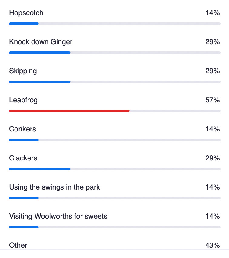 In the ‘Other’ category we had: J climbed a long rope after a gym lesson when the teacher had left. She wasn’t supposed to, and found it was very dirty towards the top, the dirt attached to her clothes and she wasn’t popular when she got home. – C was a good climber, but doesn’t climb trees anymore. – M was a tomboy, climbing anything especially if she was dared. When 8 months pregnant (in her twenties) she climbed a tree to cut some branches down. And, when playing blind mans buff she hit the bridge and fell 6 to 8 feet onto a field, luckily she didn’t fall in the nearby rocky river.