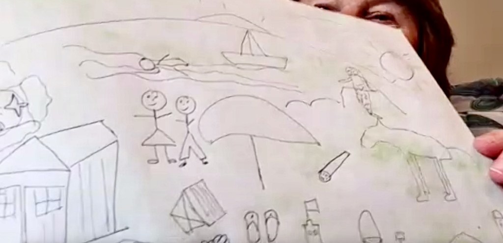 Gyda invited us to draw a list of seaside items. The speed of the session resulted in enthusiastic doodling rather than artistic masterpieces – here is Pearl’s effort. I love it!