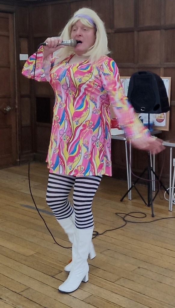 Jamie had the group singing along and dancing. Tunes included “She wears red feathers and a hula hula skirt” and “These boots were made for walking”. His new tights were a popular change from the previous psychedelic ones.