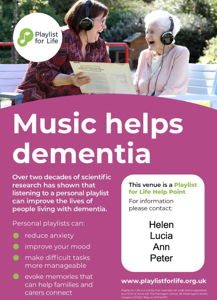 Reflections is an agent for Playlist for Life. It fits our ethos as we believe music is so important for everyone and especially for people living with dementia. Last time, team member Helen started speaking to people about identifying at least one song that held a memory for them so we can create a playlist of members favourite songs. Helen started collecting the songs this time and I have started work on the Spotify playlist. We plan to add a link to this under the recordings tab on the Home Page when it is completed.