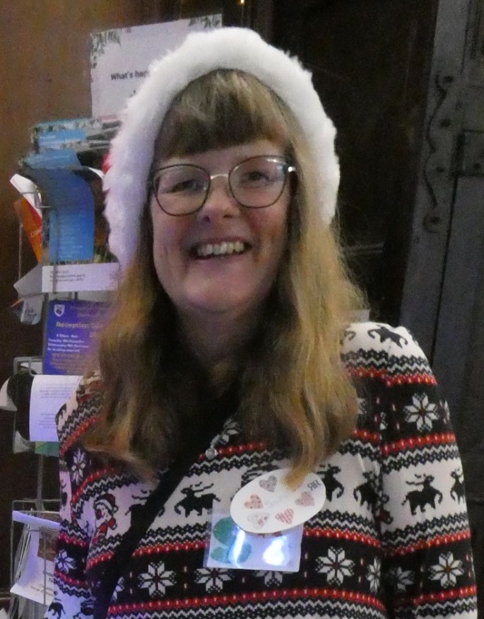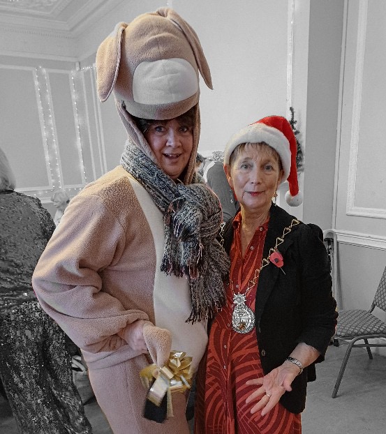 While members were having their lunch, there was a surprise visit from Father Christmas and Dominic the Donkey, aka lovely Kath, the Shrewsbury House Manager, seen here with Mayor Linda, who came in on her day off to dress up as Dominic. Father Christmas and Dominic were followed around by Peter with his phone and a speaker playing the Dominic the Donkey song sung by Lou Monte. It’s a catchy song. Father Christmas handed out a small goodie bag to all the members.