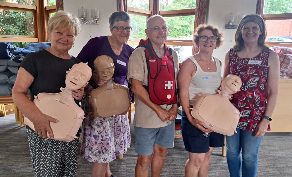Helen, Lucia, Tony, Janet and Linda with CPR practice dummies and Tony wearing choking Charlie, the practice gizmo for abdominal thrusts.